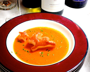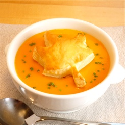 This bright colorful soup is quick and easy to make. It can be turned into an elegant presentation by using puff pastry cut-outs as a garnish. Here I’ve chosen reindeer and little stars as an elegant first course for Christmas dinner and a maple leaf for a fall supper.