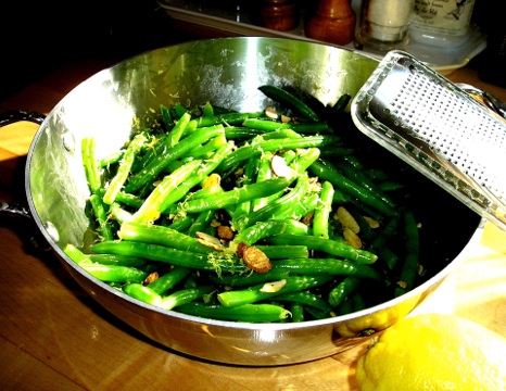 Right before serving, put the beans in a large skillet- gently warm them and toss them around for 1-2 minutes. Add the melted lemon butter- salt and pepper to taste- and sprinkle with the lemon zest and almonds and toss well- serve hot.