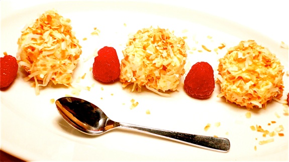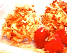Using a small scoop- or melon baller make balls of ice cream and roll it in the coconut. Serve with fresh berries in season and a little sprinkling of the coconut. That’s all there is to it!