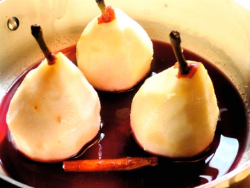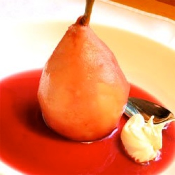 Poached pears are a simple yet elegant dessert. Here i have poached them in a red wine syrup- I like the color the pears take on. Word of caution though- the red syrup can stain your table linens- not to mention the dessert eaters clothing. An alternative would be to poach them in a nice Sauternne- you can leave out the sugar when doing so.