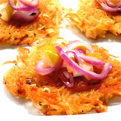 These crispy pancakes are very easy and so very good. Shredding the potatoes in a Cuisinart is the only way to go. These really should be served hot right off the griddle- they don’t keep well or reheat well as they lose all their crispy charm. We are a house divided-with some of us preferring the sour cream topping- others like a dollop of red onion apple compote- I like a both.