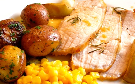 Roast the meat for about 45-60 minutes or until the internal temp reaches 150 degrees. Cooking time will depend on the size of the roast. Let rest for 10 minutes or so before slicing. I like to keep the slices on the thin side- pouring the pan juices over the sliced meats. Along with the roasted veggies and apples- i like to pair it with parsley buttered new potatoes.