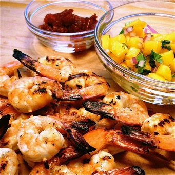 Drizzle the shrimp with the butter/lemon juice and serve with condiments of your choice- i like the sweet/savory combo of a mango salsa and a tomato jam.
