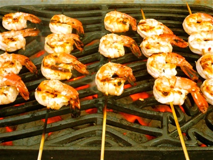 Thread the shrimp onto the wooden skewers - place them on the hot grill. Total cooking time if the coals are hot should be about 3 minutes- turning once.