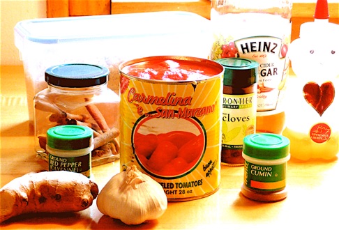 Stir in the tomatoes, sugar,cumin,cayenne and cloves. Reduce the heat to low and cook, stirring occasionally, until the liquid has evaporated- about 45 minutes.